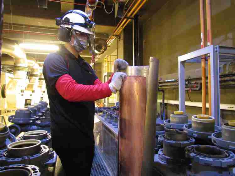 至成国际将废弃物转化成有效的工业或民生原物料,,图为废铜液淬炼后再制成纯度极高的铜管