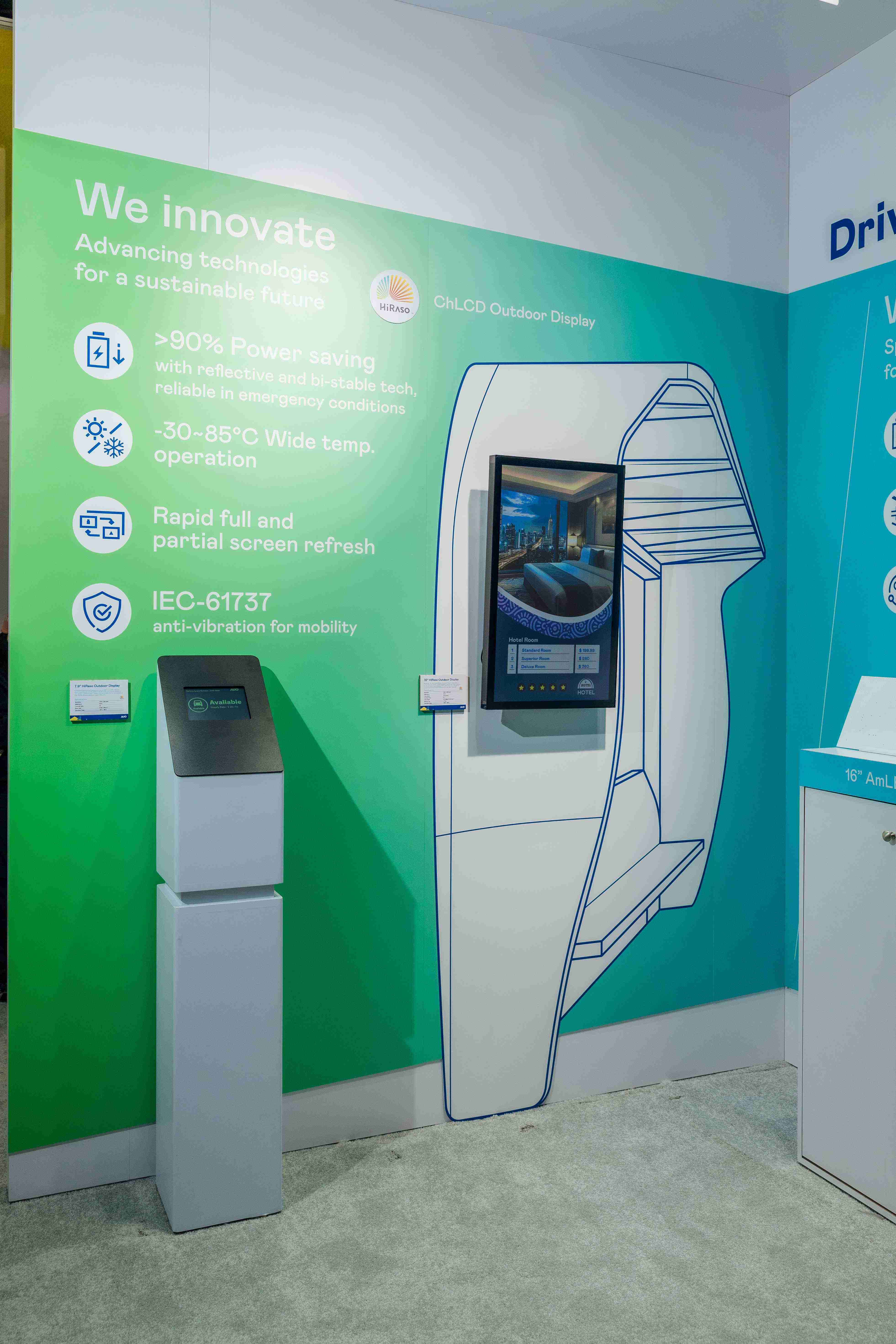 HiRaso胆固醇液晶显示器运用反射环境光线的方式,,呈现影像显示时零耗能的环保省电诉求,,光线愈强愈能呈现绝佳的色彩饱和度及显示效果,,,,同时在摄氏-30度至85度间宽温的使用优势,,,,为户外电子看板的新首选。。。