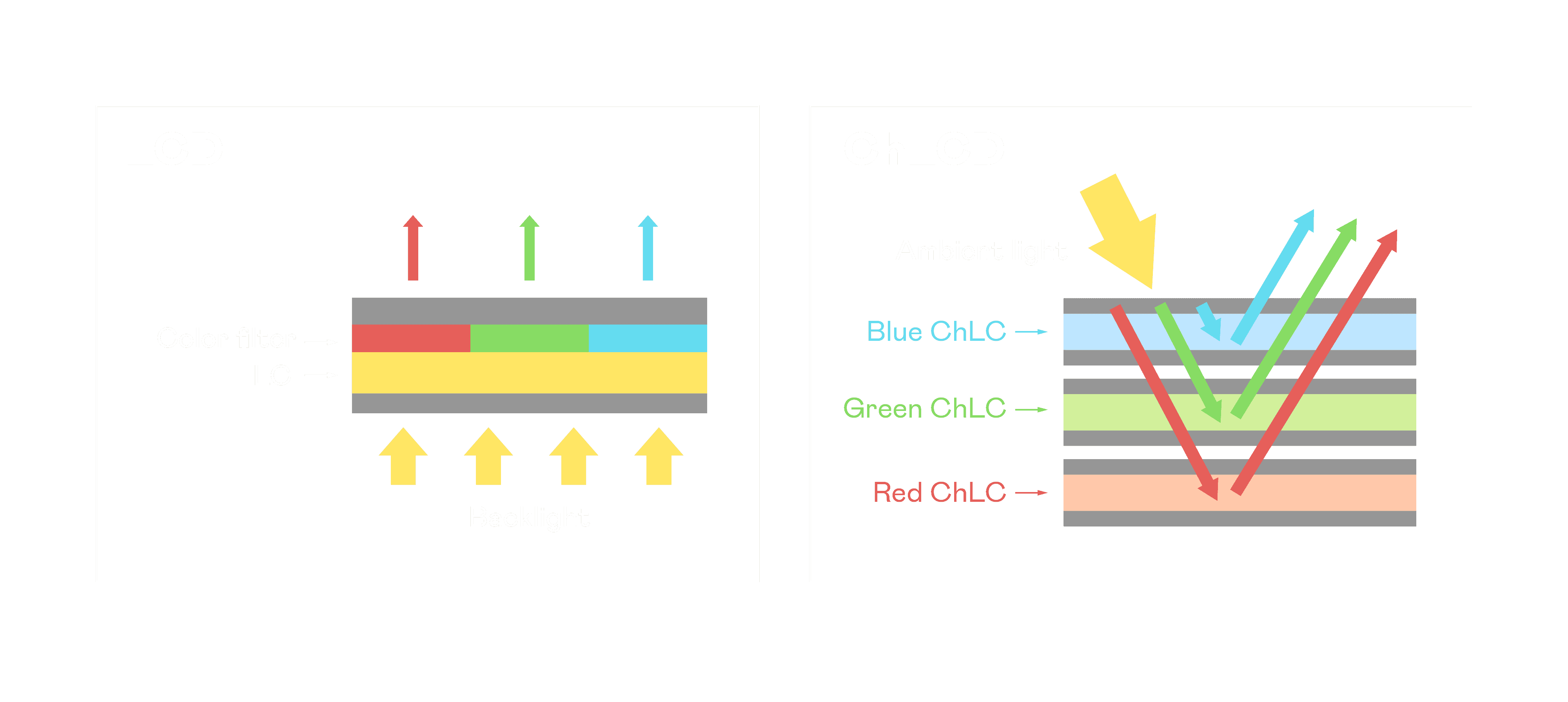 ChLCD 胆固醇液晶就如同纸张一样,,,透过反射环境光来显示影像,,因此长时间观看不易造成人眼视觉疲劳,,可达到护眼效果。。当处于户外阳光下使用,,,LCD 影像容易失真而不易观看,,,但胆固醇液晶仍可维持较佳的影像品质。。