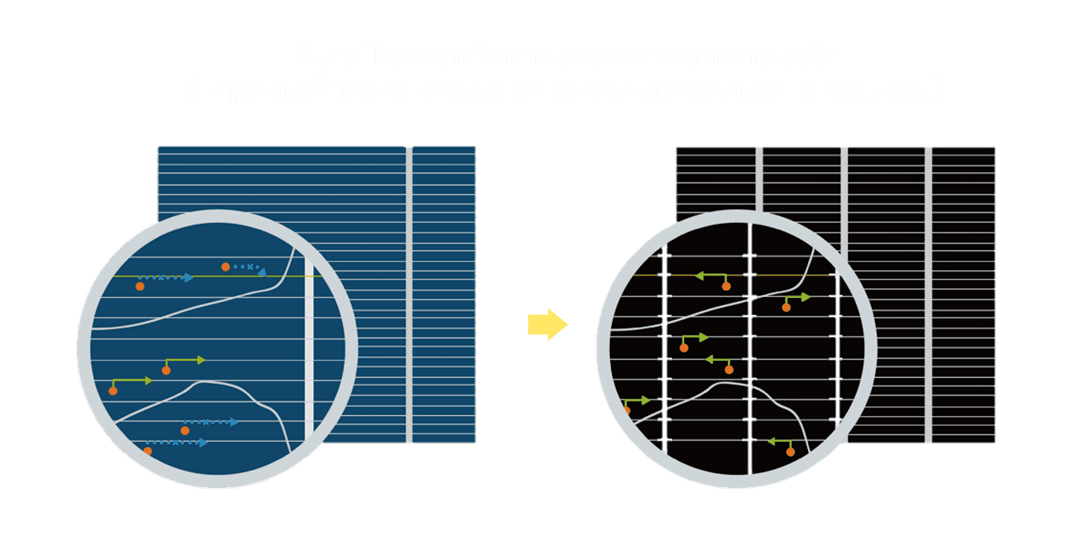 - 电池使用多条铜导线 (Copper wire) 于电池片上形成较短的电流路径,,,,提高电流收集效率,,采用圆形设计的铜导线较传统扁平式的铜焊带 (Ribbon),,可增加入射至电池的光线量。。。。